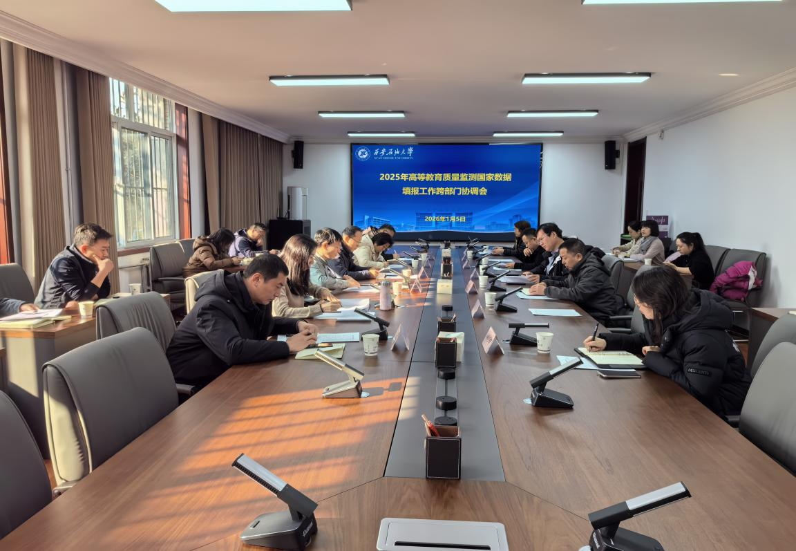 1月5日上午,学校在鄠邑校区第三会议室召开2025年高等教育质量监测国家数据填报工作跨部门协调会。副校长张君涛出席会议,党委学生工作部、人事处、教务处、实验室管理处、科研处、研究生工作部、财务处、国有资产处、高教研究与评估督导中心、图书馆主要负责人,各单位数据填报老师参加了会议。会议由高教研究与评估督导中心主任时保宏主持。